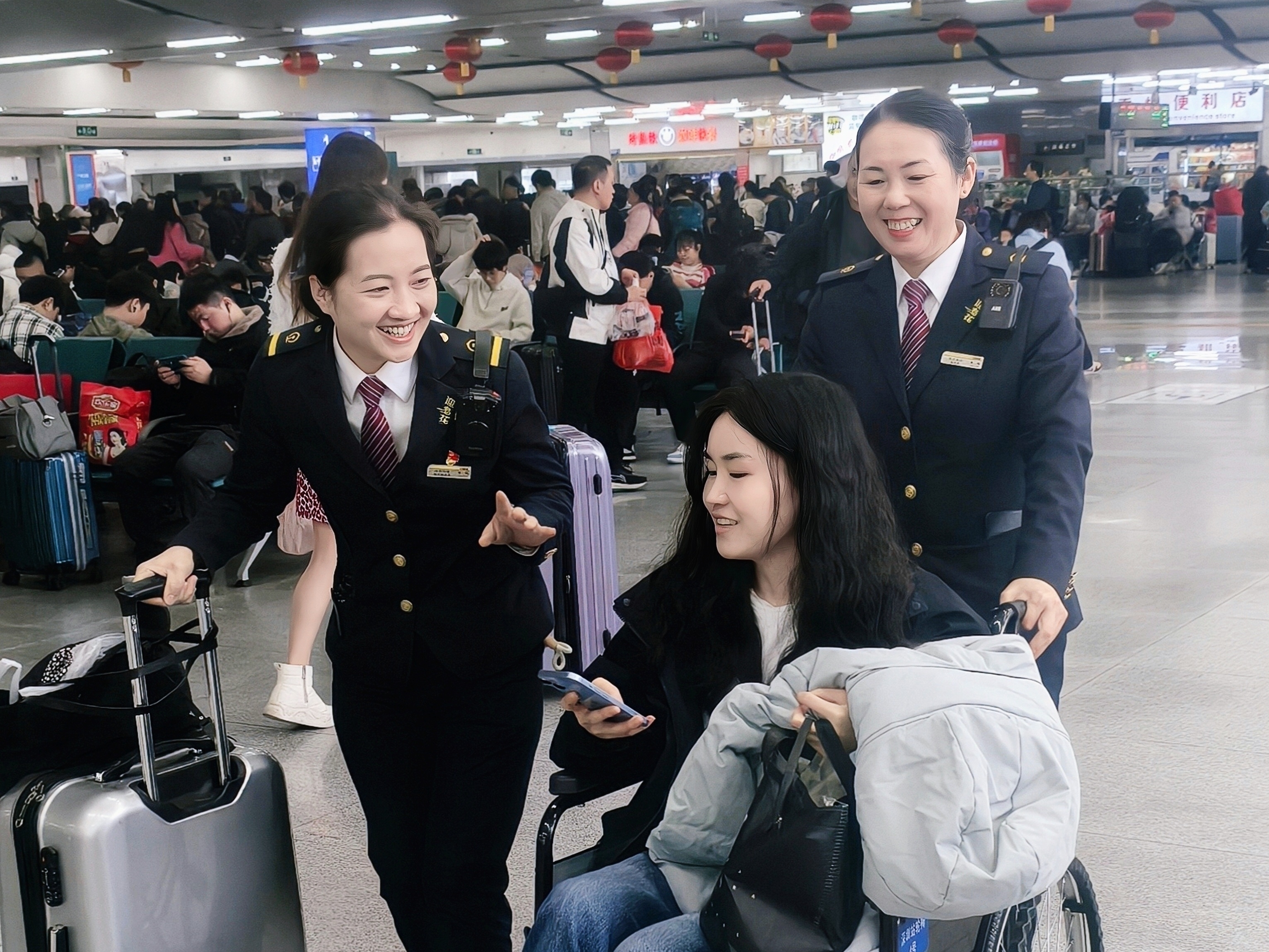 服务旅客无小事,景欣始终把重点旅客的需求放在心上,牵头搭建起爱心服务联动机制,全力打通旅客出行“最后一公里”。“G2705次有两位老人需要轮椅协助出站”,接到对讲机里的通知,景欣立刻拿起轮椅,快步赶往站台。她提前对接好地铁工作人员,在指定地点等候,全程小心推着轮椅,避开拥挤人流,平稳将老人送到交接点。“不少老年旅客看不懂电子屏,我们多搭把手、多提醒一句,他们的出行就能少点麻烦。”景欣如是说。2025年以来,在她的统筹推进下,班组已累计帮助1.3万余名重点旅客解决出行难题。