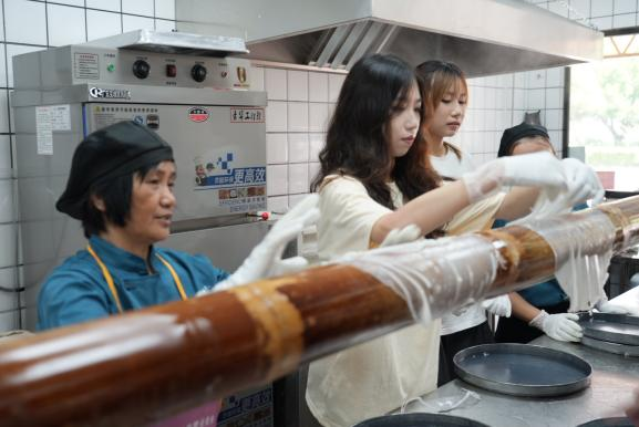 “大家看,这米浆要蒸得薄如蝉翼,挂在竹篙上才能吸收竹子的清香!”在德庆竹篙粉旗舰店的操作间,队员们一边跟着传承人学习制作竹篙粉,一边通过镜头向网友展示这道非遗美食的诞生过程。