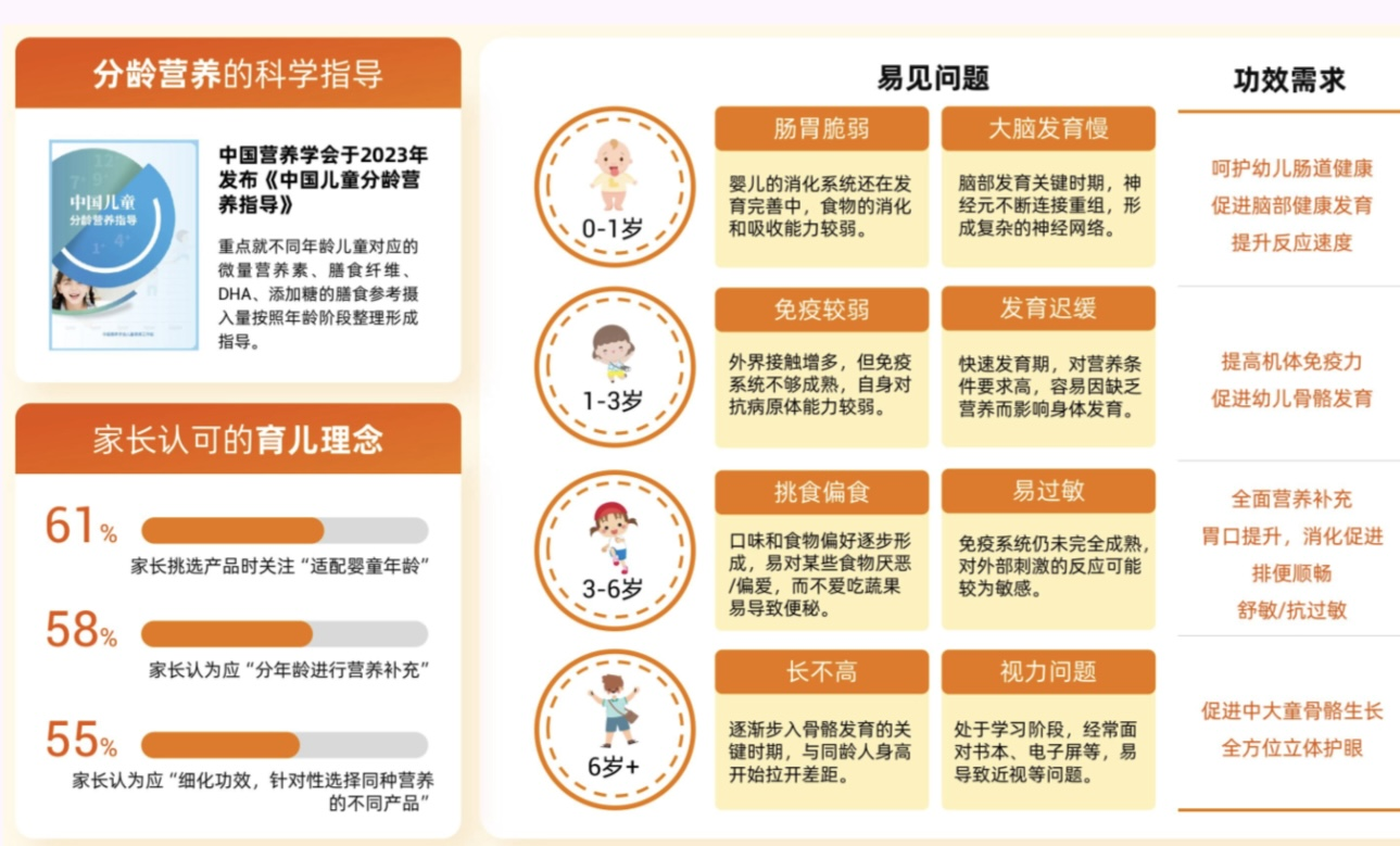 据《2024婴童营养品消费洞察白皮书》数据显示,超70%的年轻家长在选择儿童营养品时,将“配方科学性”与“年龄适配度”作为核心决策指标,这意味着产品需从“满足功能”转向“精准匹配”,消费需求反推商家提供更全面的儿童成长营养解决方案。