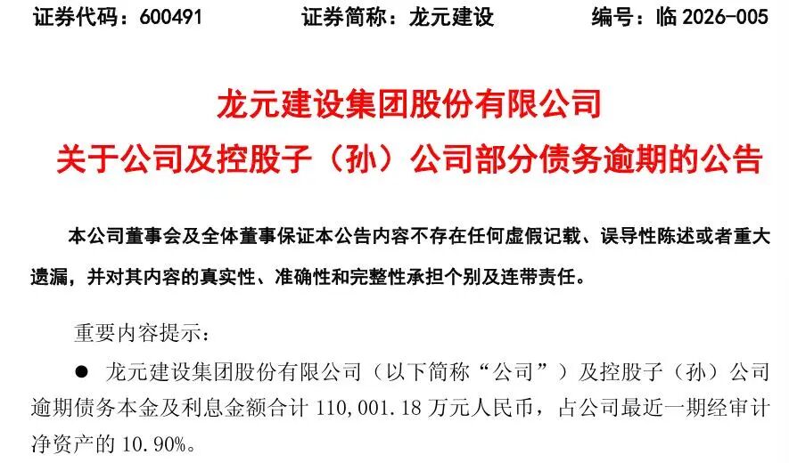 龙元建设4月13日晚间披露,公司及控股子(孙)公司逾期债务本金及利息金额合计11亿元,占公司最近一期经审计净资产的10.90%。